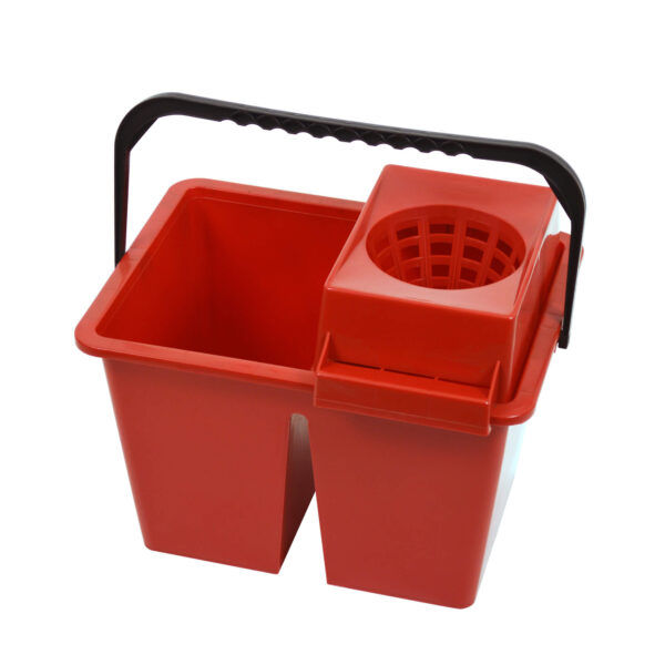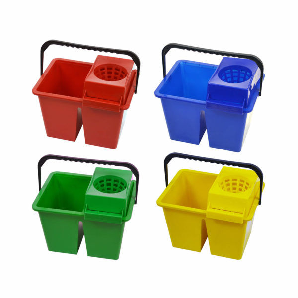 12 litre capacity (2 x 6ltr). Compact double bucket design to separate clean and dirty mopping solution. Colour-coded, with a hardwearing carry handle and removable socket mop sieve.
